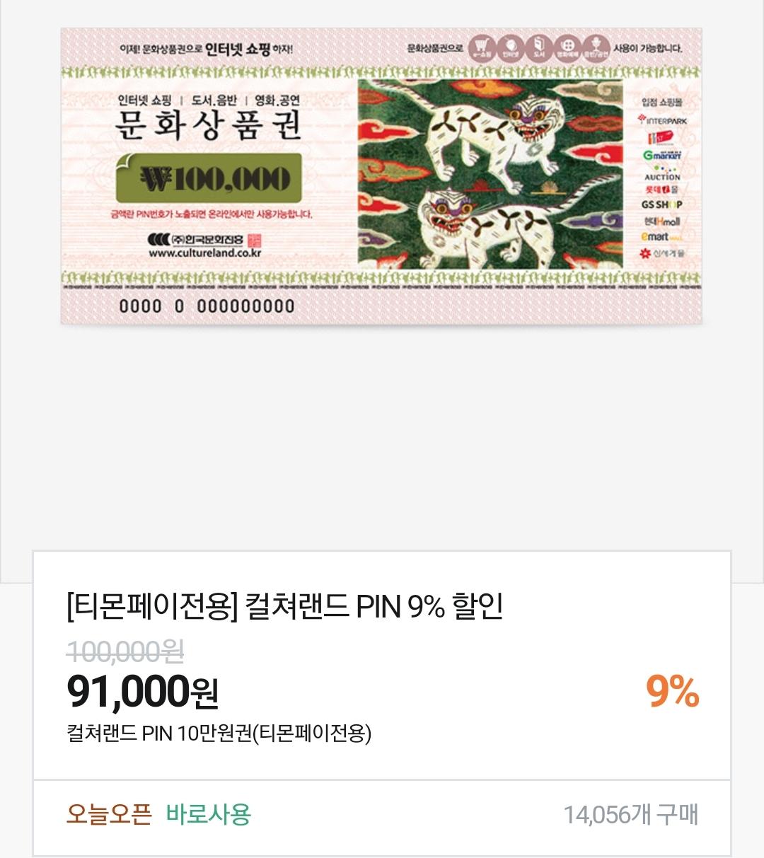[티몬페이전용] 컬쳐랜드10만원권 PIN 9% 할인 (91000/무료) > 국내핫딜