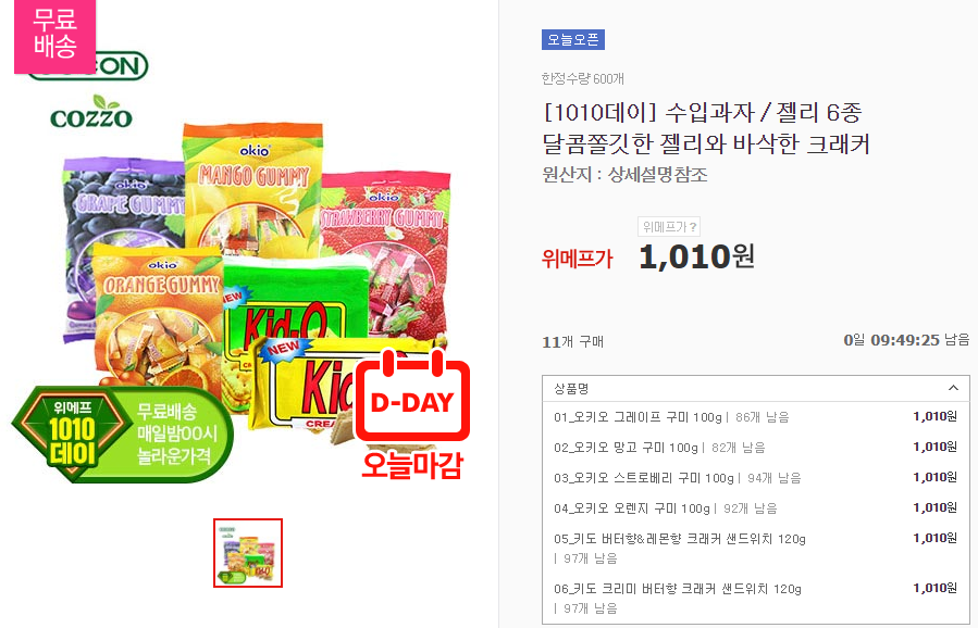 [위메프] 오키오젤리,키드오과자 택1 포인트소진용 (1,010원/무료)