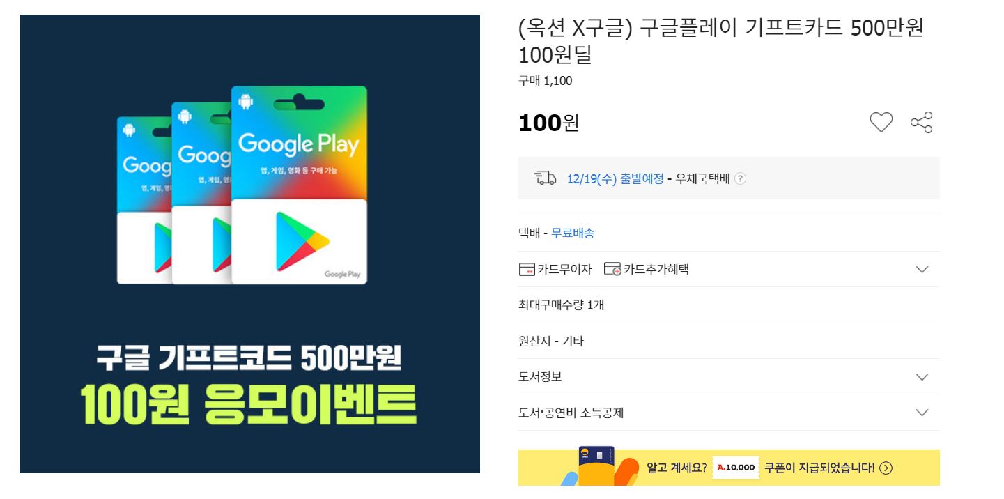 [옥션] (옥션 X구글) 구글플레이 기프트카드 500만원 100원딜 (100원/무료배송)