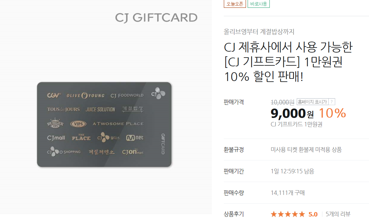 [티몬] CJ기프트카드 1만원 (9,000/0)