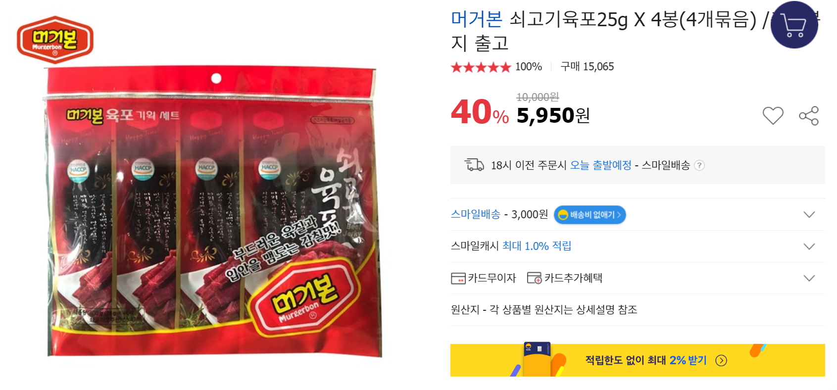 끌올 [옥션] 머거본 쇠고기육포 25g*8봉 (7,900원/3,000원) 스마일클럽은 무료배송 > 국내핫딜