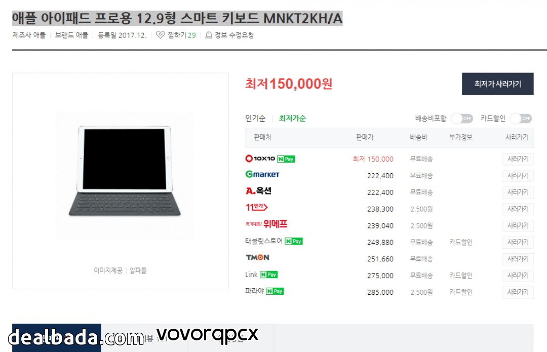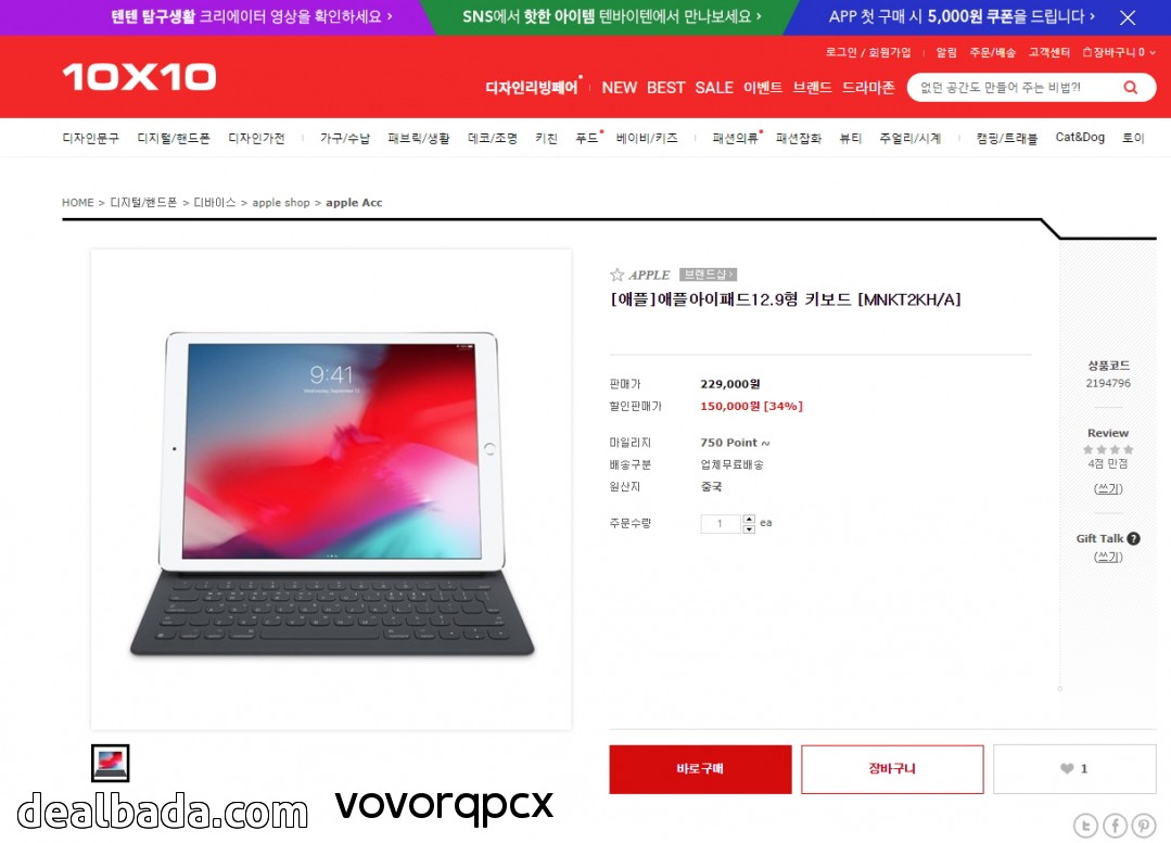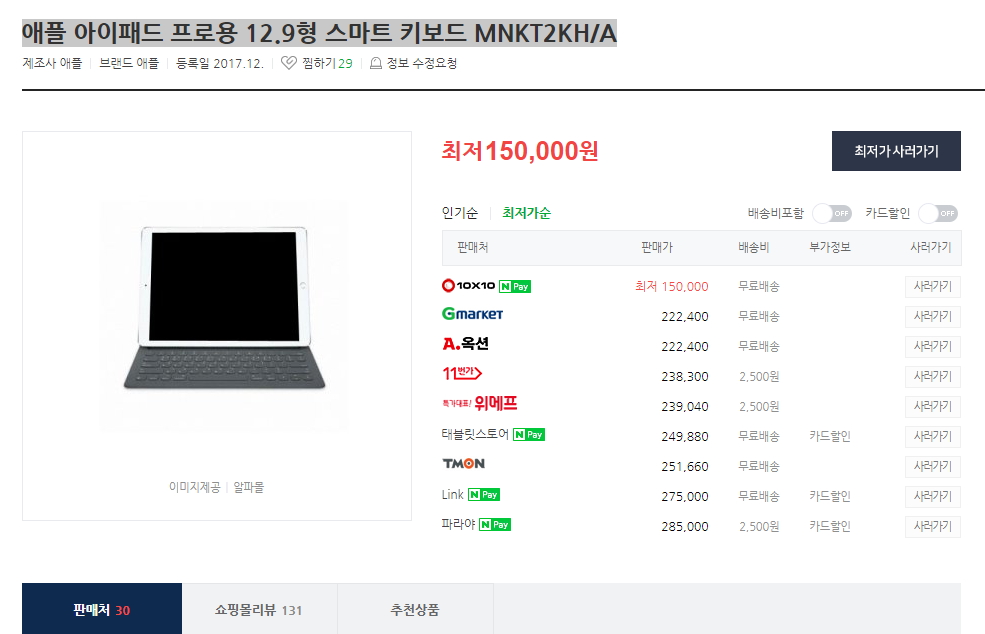 [텐바이텐] 애플 아이패드 프로용 12.9형 스마트 키보드 MNKT2KH/A (150,000원/무료) > 국내핫딜