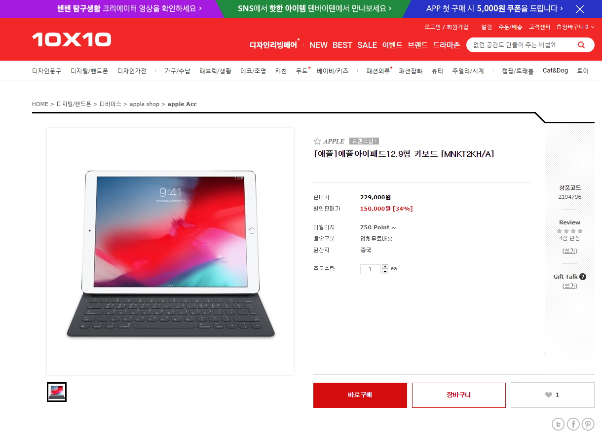 [텐바이텐] 애플 아이패드 프로용 12.9형 스마트 키보드 MNKT2KH/A (150,000원/무료)