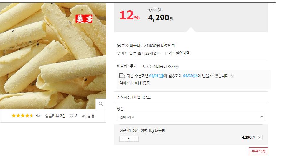 동네마트에서 250g 한봉짜리 종합전병에 생강전병은 낱개로 2개 들어있더라구요...