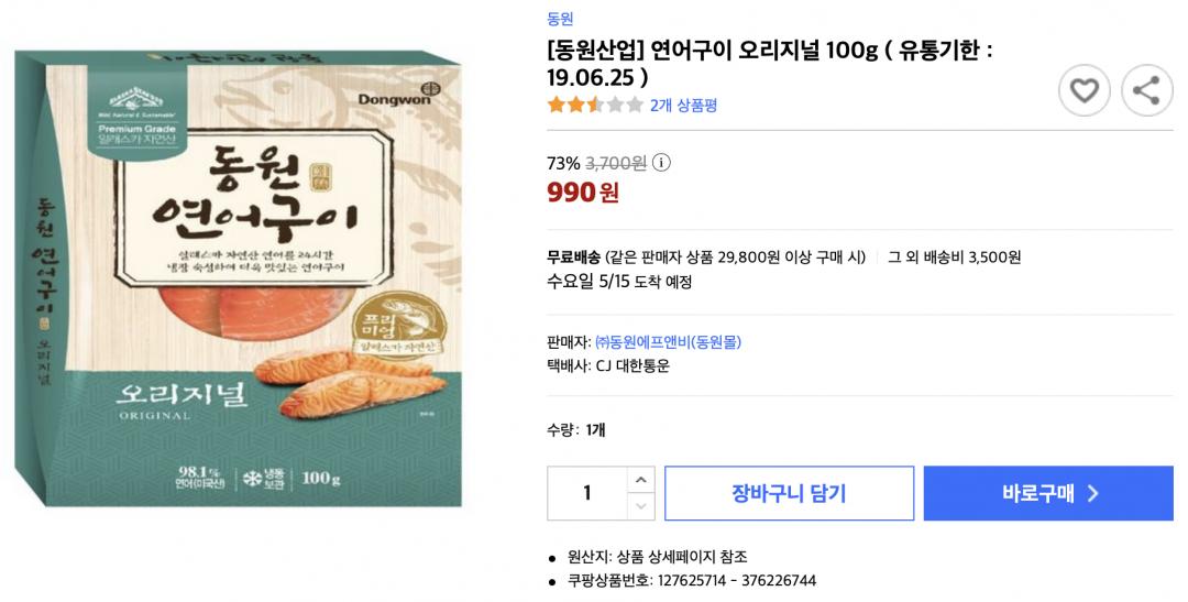 [쿠팡] 연어구이 오리지널 100g (990원/3,500원)