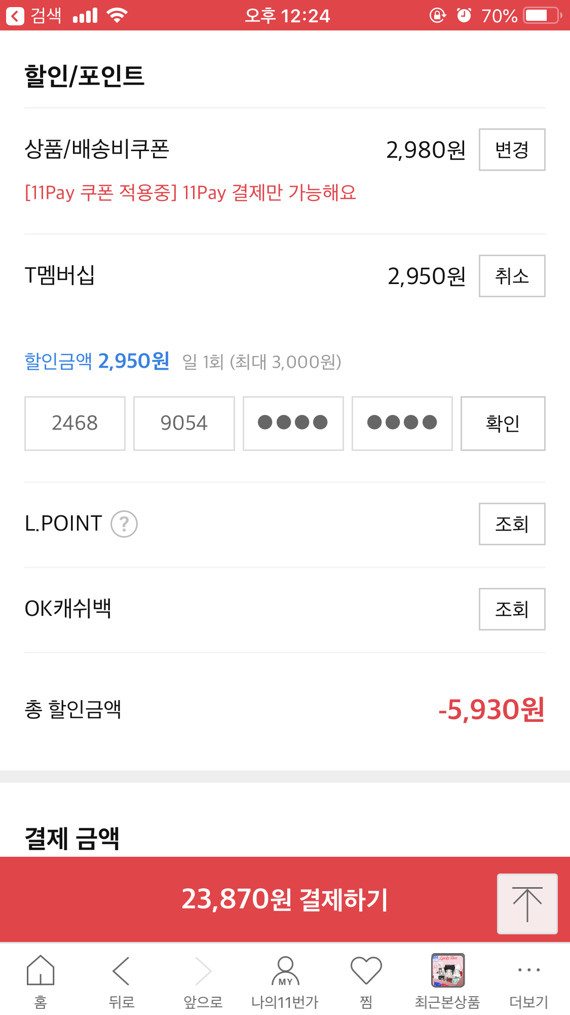 11페이 결제, 티맴버십 할인받아서 결제하면 2.3만대까지 떠요