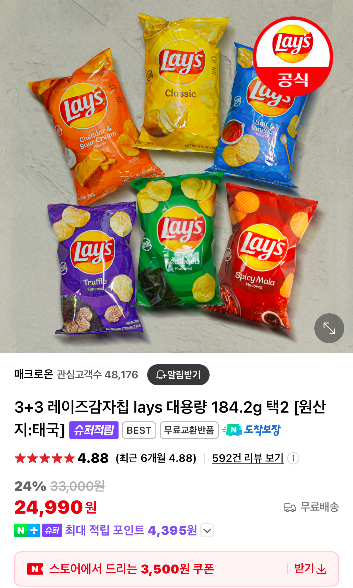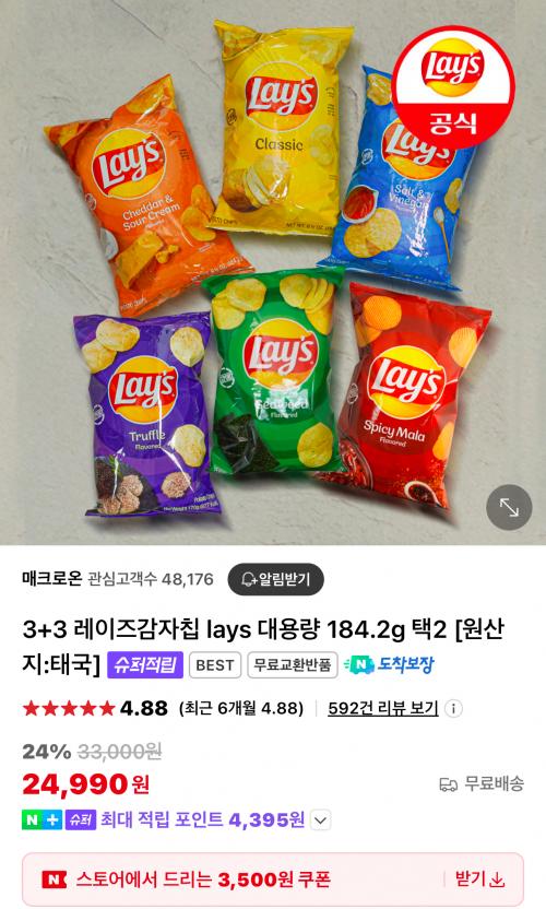 [네이버]3+3 레이즈감자칩 lays 대용량 184.2g 택2(24,990원/무배) > 국내핫딜