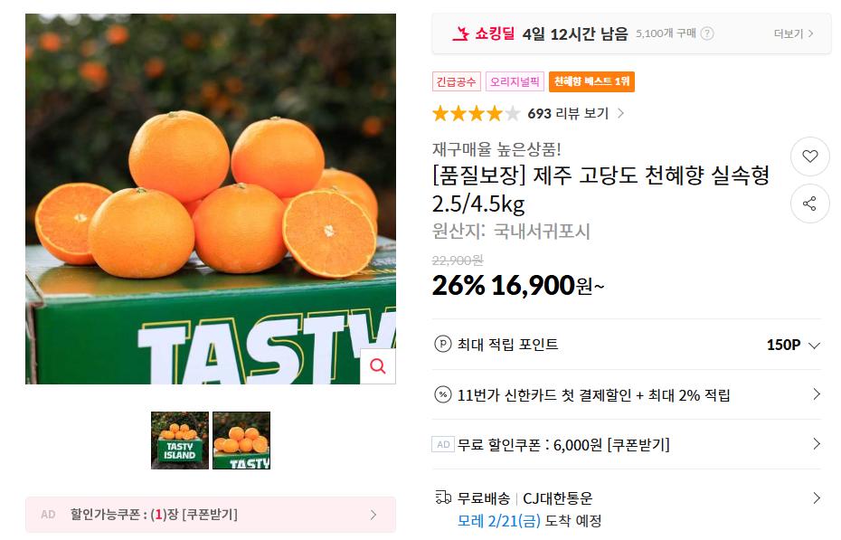 [11번가] 천혜향 2.5kg (16,900원/무료)