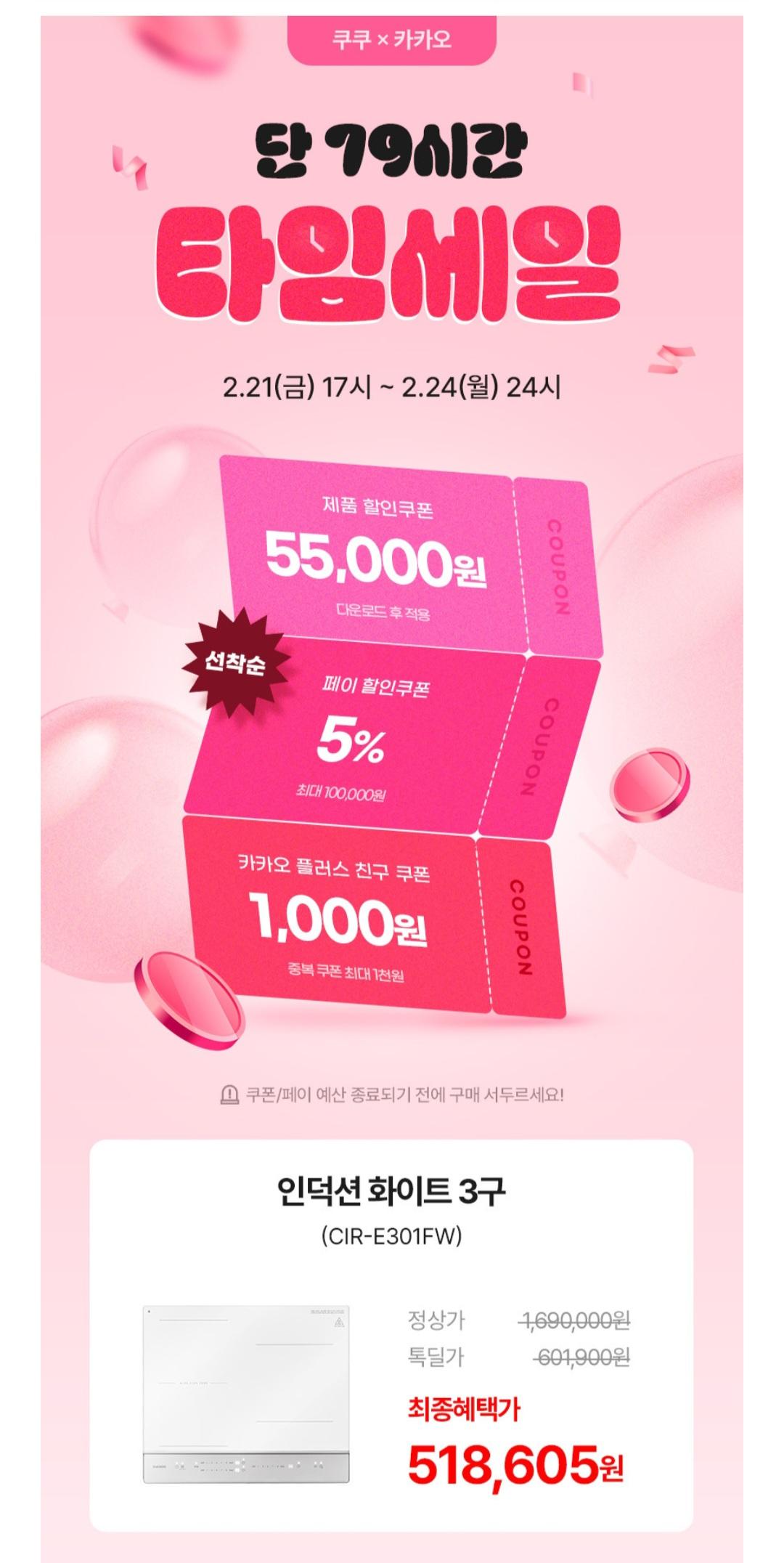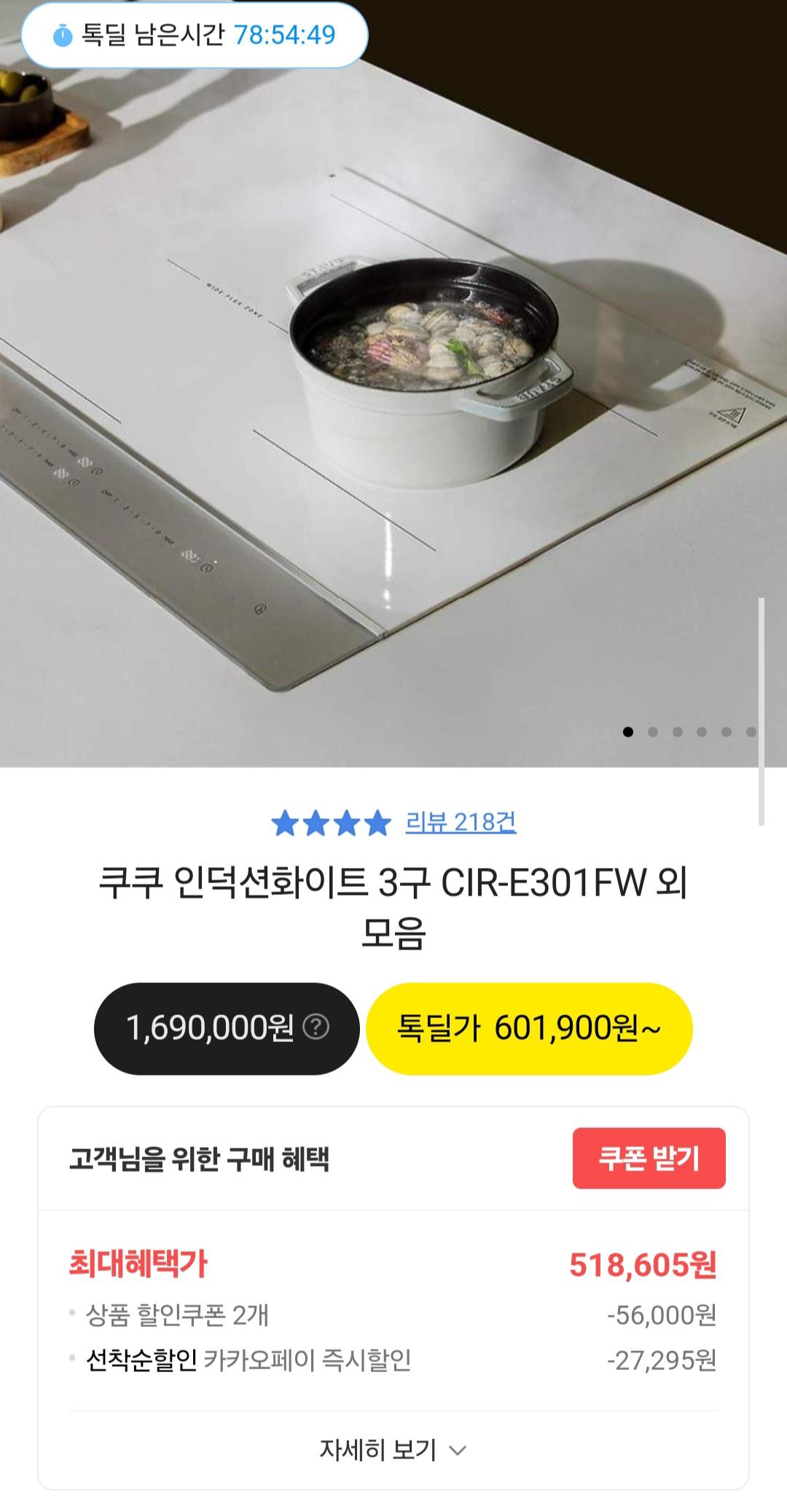 [카카오] 쿠쿠 인덕션 화이트 3구 (518,605원/무료)