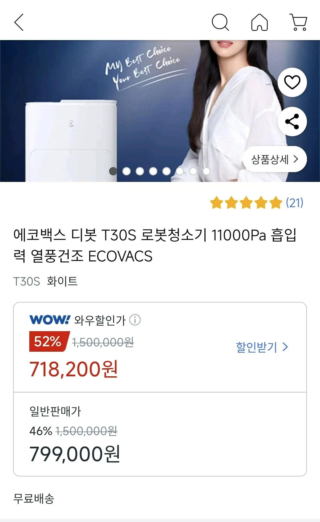 [쿠팡]에코백스 디봇 T30S 로봇청소기 11000Pa 열풍건조 (718,200원/무료)