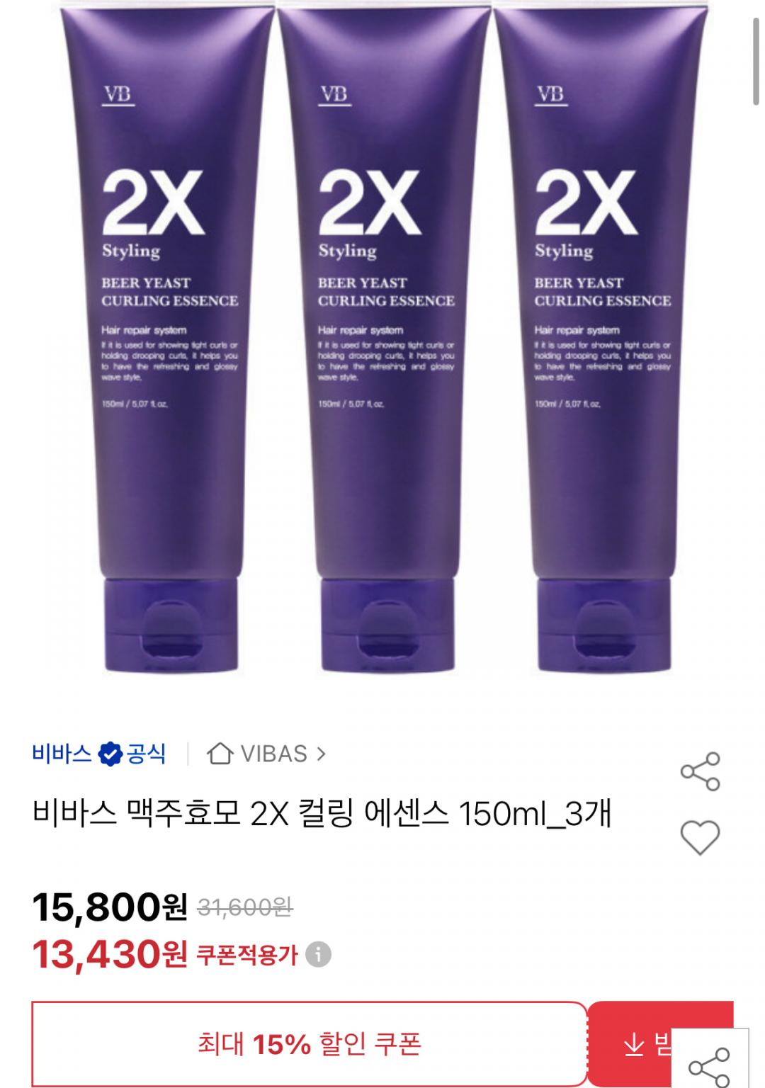 [옥션] 비바스 맥주효모 2X 컬링 에센스 150ml 3개 (13,430원/무배) > 국내핫딜