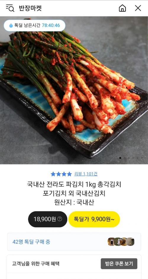 [카카오] 국내산 전라도 파김치 1kg 외 총각김치 포기김치 등 (9,900원/무배) > 국내핫딜