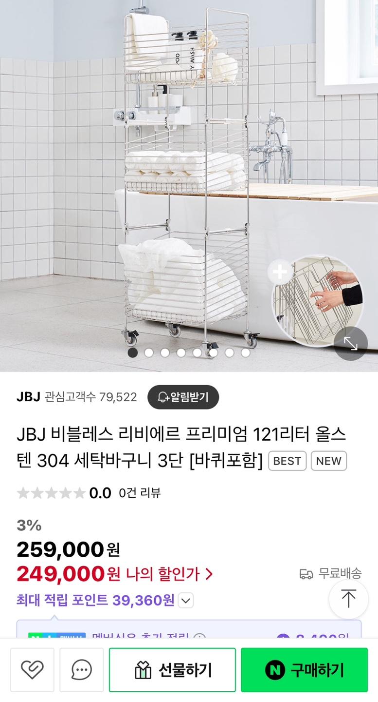 [네이버] JBJ 비블레스 리비에르 프리미엄 304 스텐 세탁바구니 3단 (259,000원/무료)