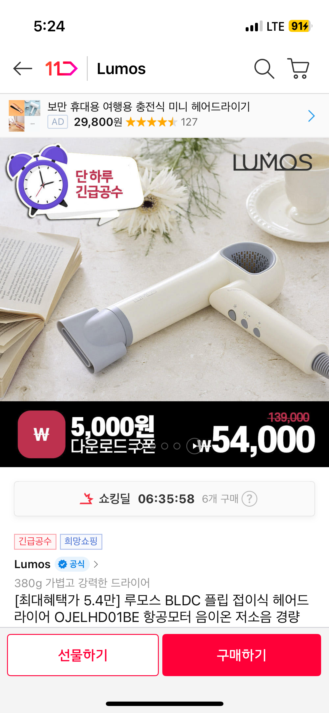 [11번가] 루모스 BLDC 플립 접이식 헤어드라이어 (54,000원/무료)