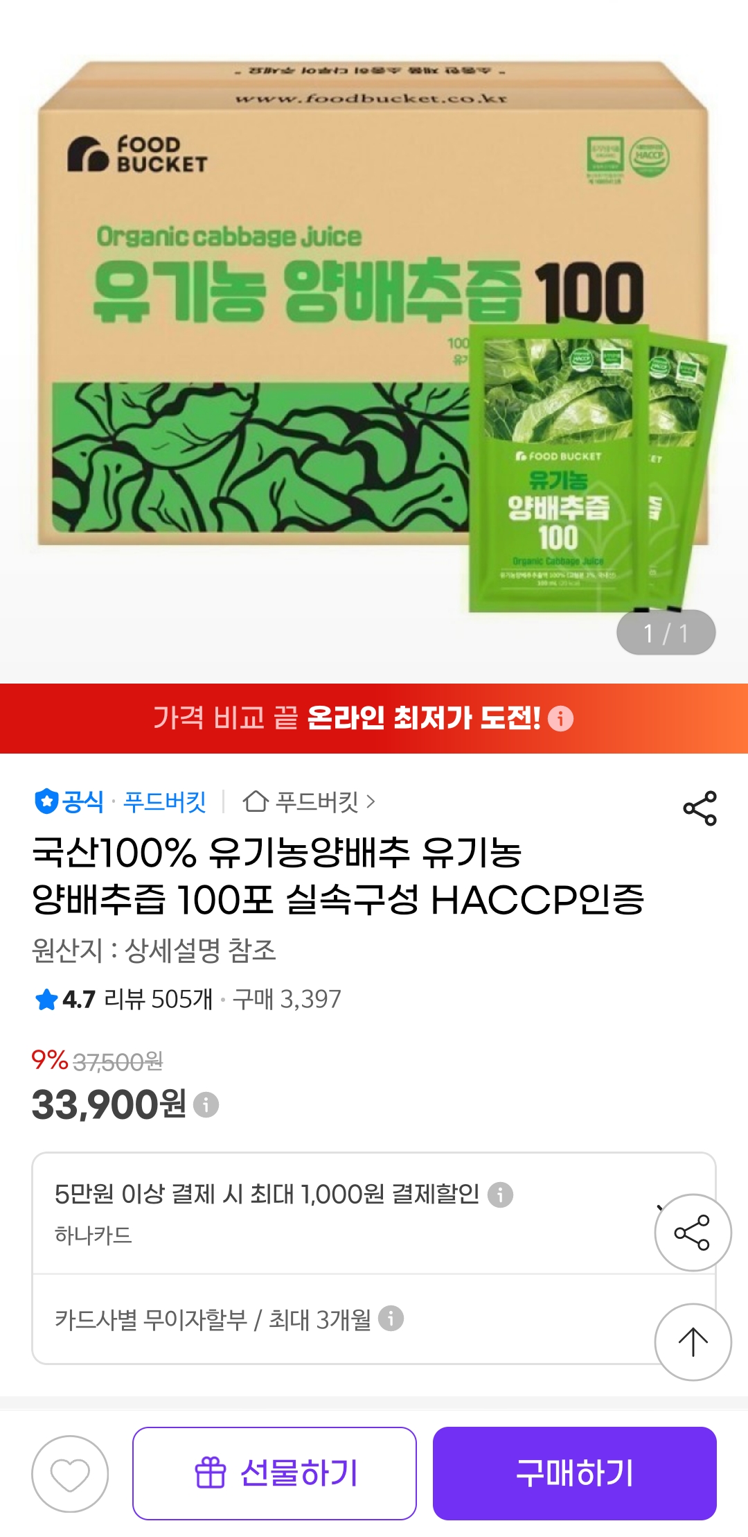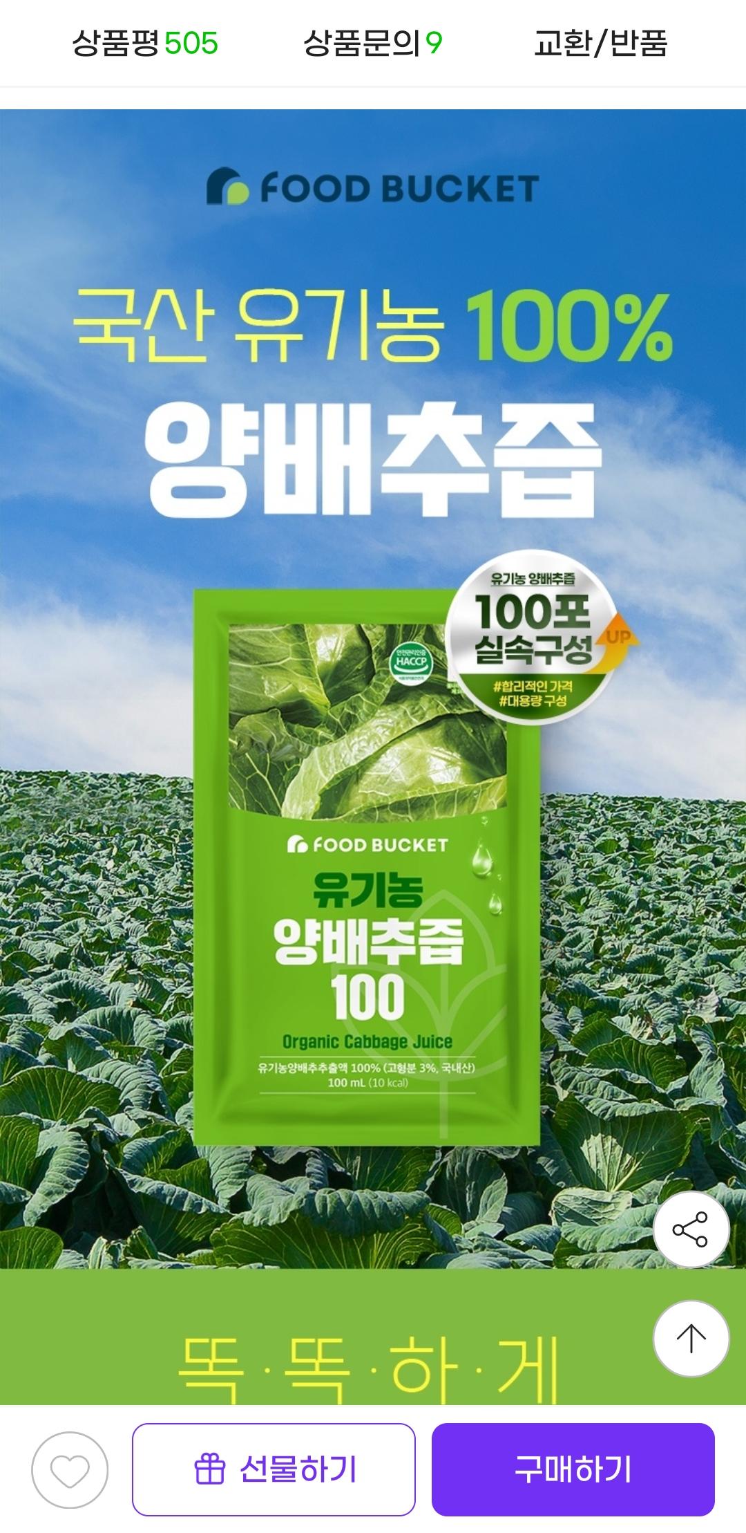 지마켓) 푸드버킷 유기농 양배추즙 100포 개당 339원 (33,900원/무료) > 국내핫딜