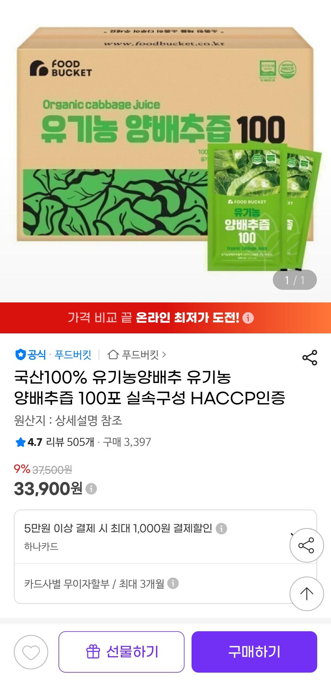 HACCP인증 받은 유기농 양배추즙 할인 하네요.