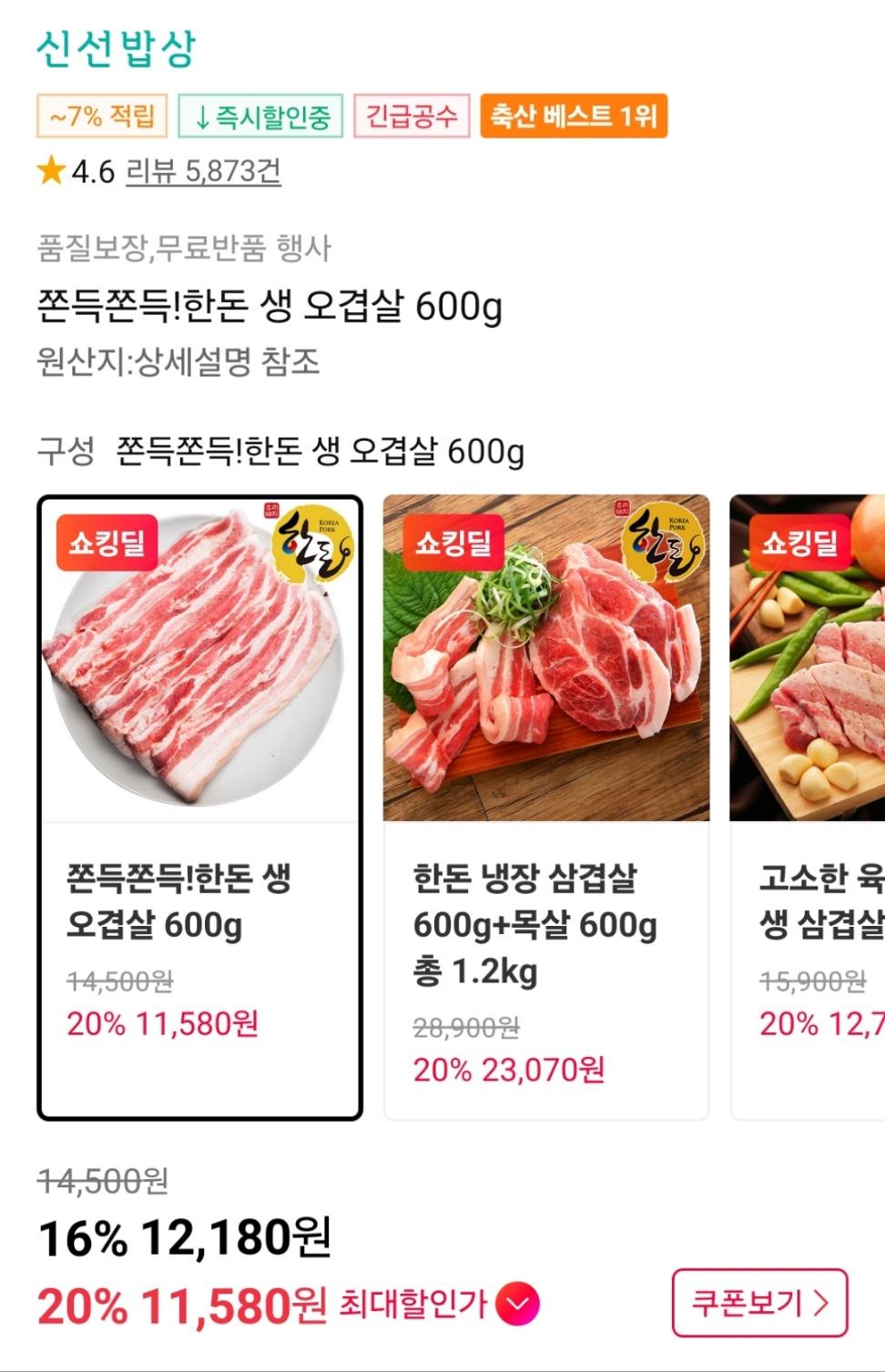 [11번가] 한돈 생 오겹살 600g (11,580원 / 무료)