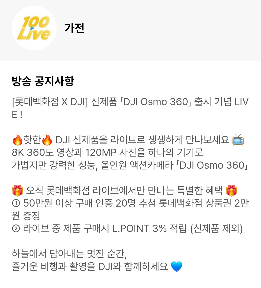 롯데백화점 인천점에서 DJI 라이브 방송이에요일시는 내일 오후6시이구요