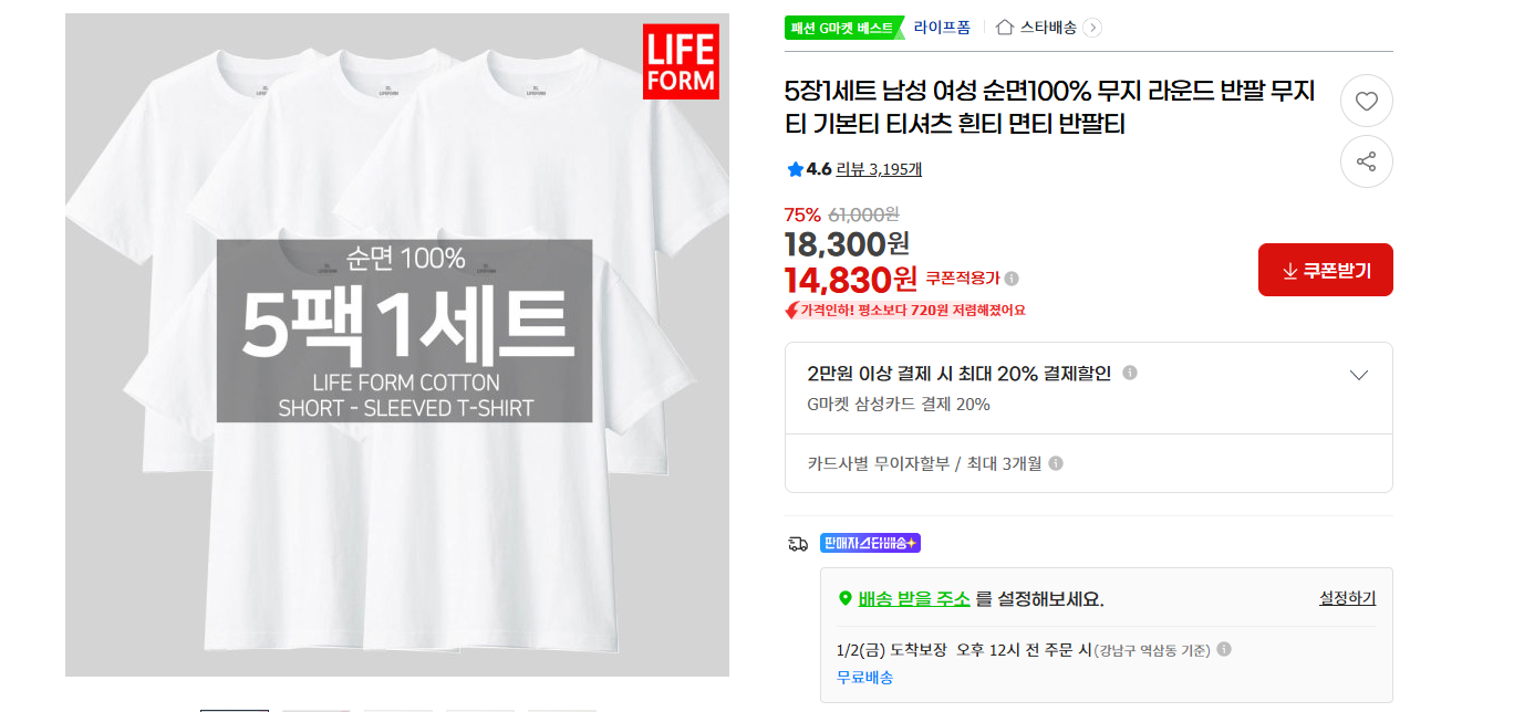 [지마켓] 5장1세트 남성 여성 순면100% 무지 라운드 반팔 14,830원/무배 > 국내핫딜