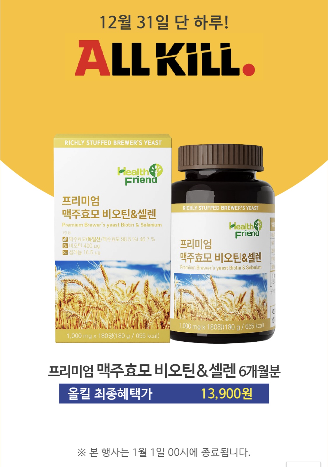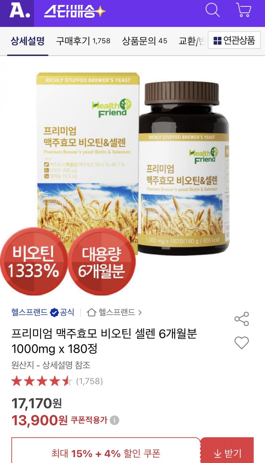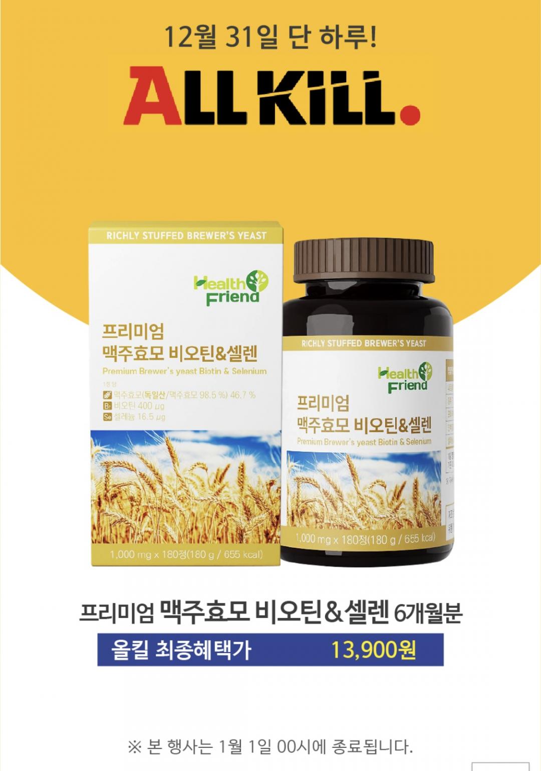 [옥션] 탈모예방 프리미엄 맥주효모 비오텐&셀렌 6개월분 180정 (13,900원/무료)