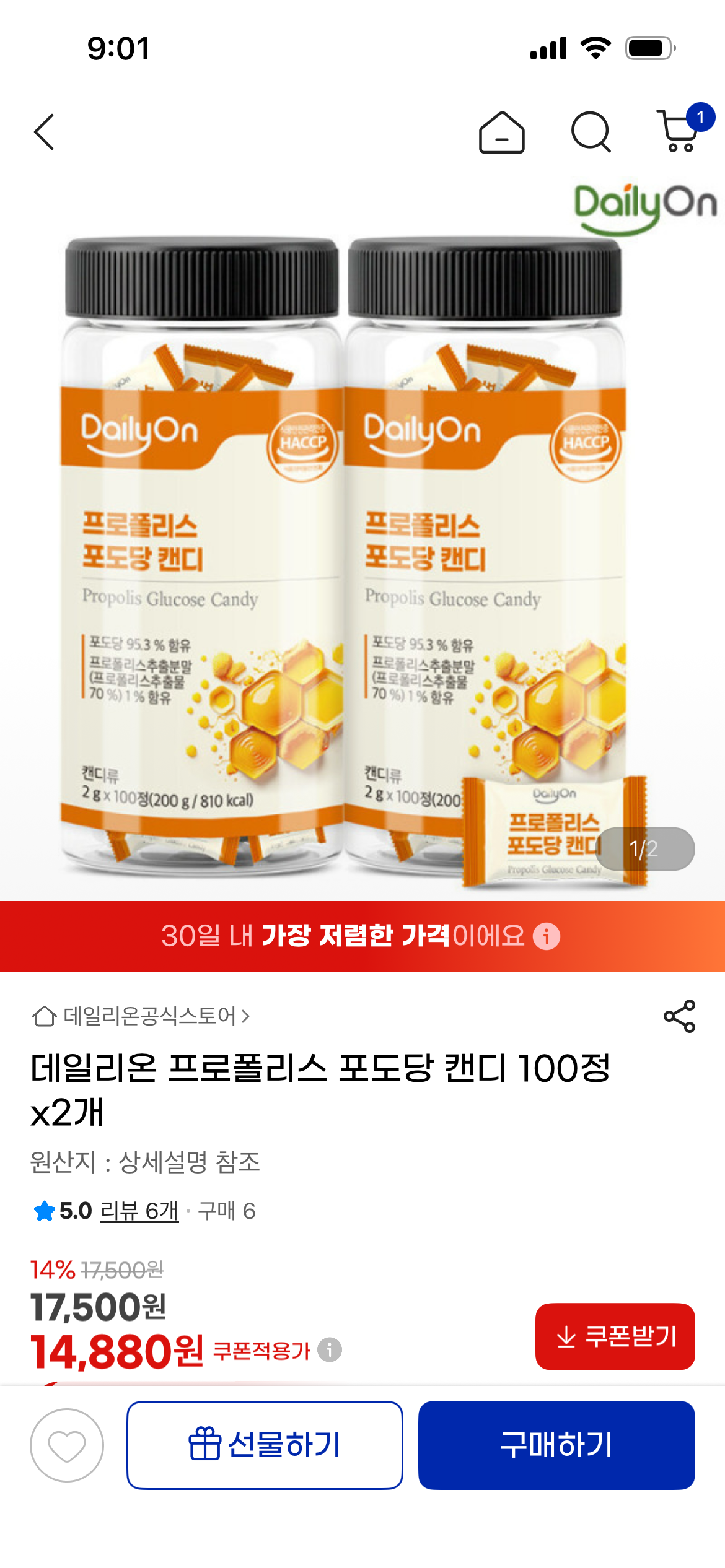 [지마켓] 데일리온 프로폴리스 포도당 캔디 100정x2개 (14,880원/무료) > 국내핫딜