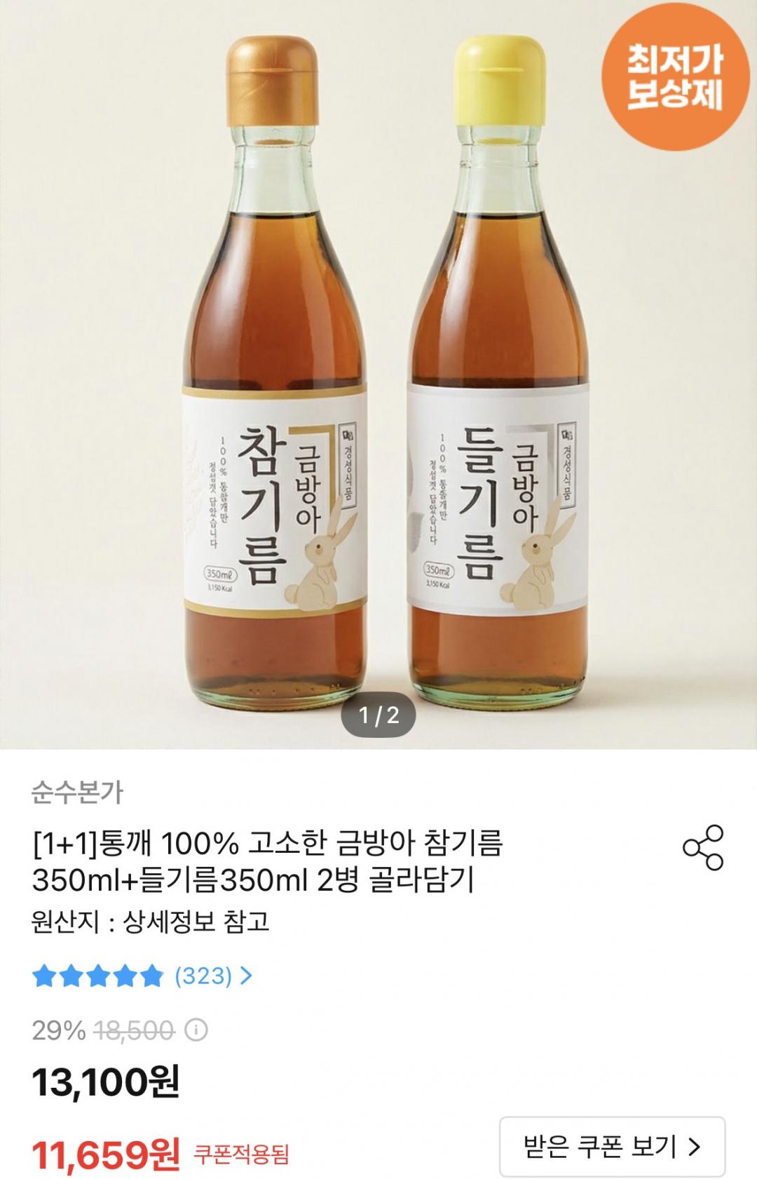 [오늘의집] 통깨 100% 고소한 금방아 참기름350ml+들기름350ml 2병 (11,659원/무료)