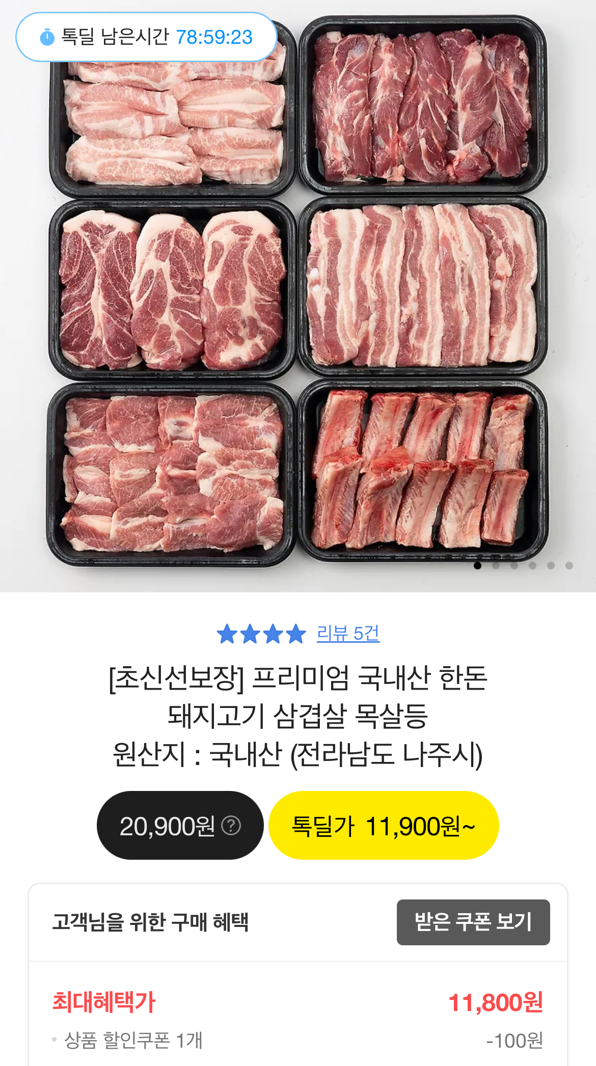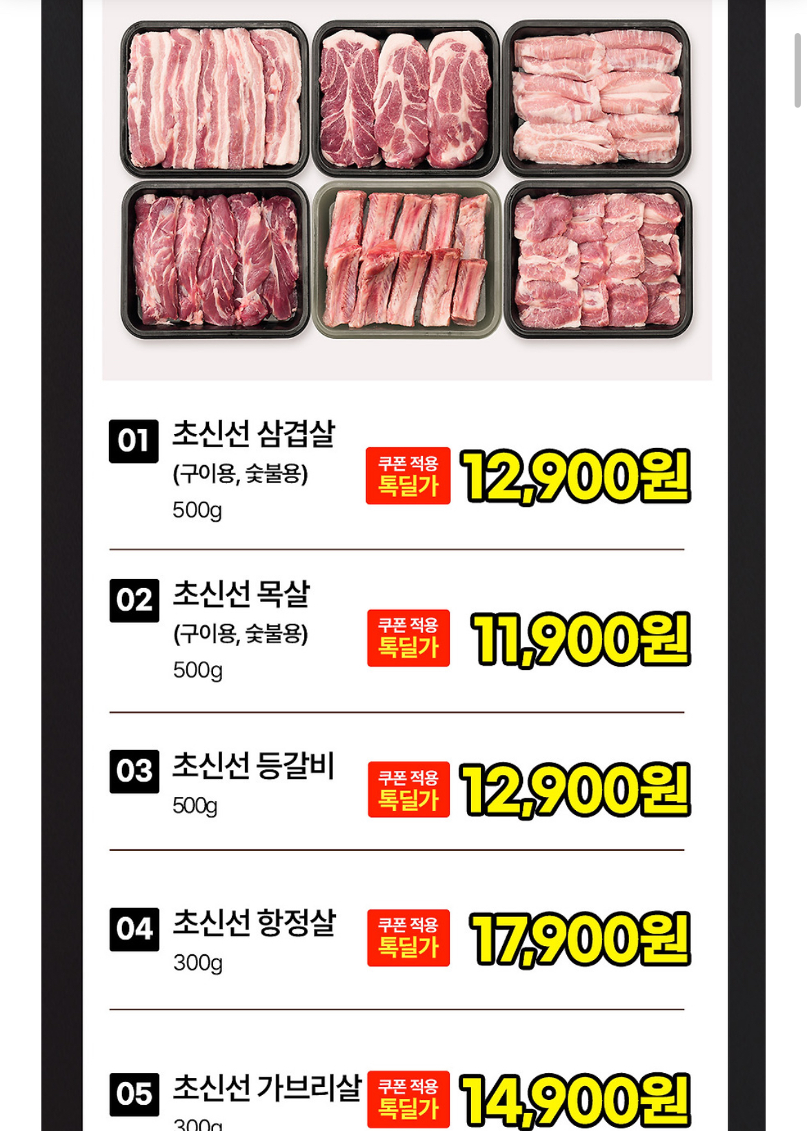 1등급 국내산 삼겹살 500g 11,900원이요
