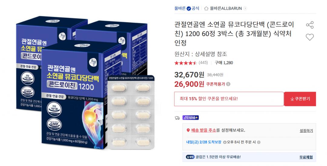 식약처에서 관절,연골 건강 기능성 인정받은 제품이에요