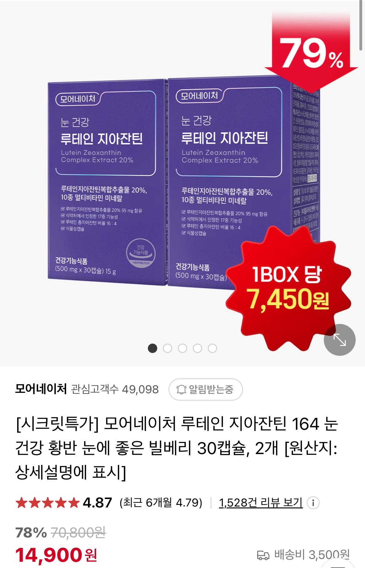 [네이버] 눈 건강 루테인 자아잔틴 30캡슐 2개 (14,900원/유배)