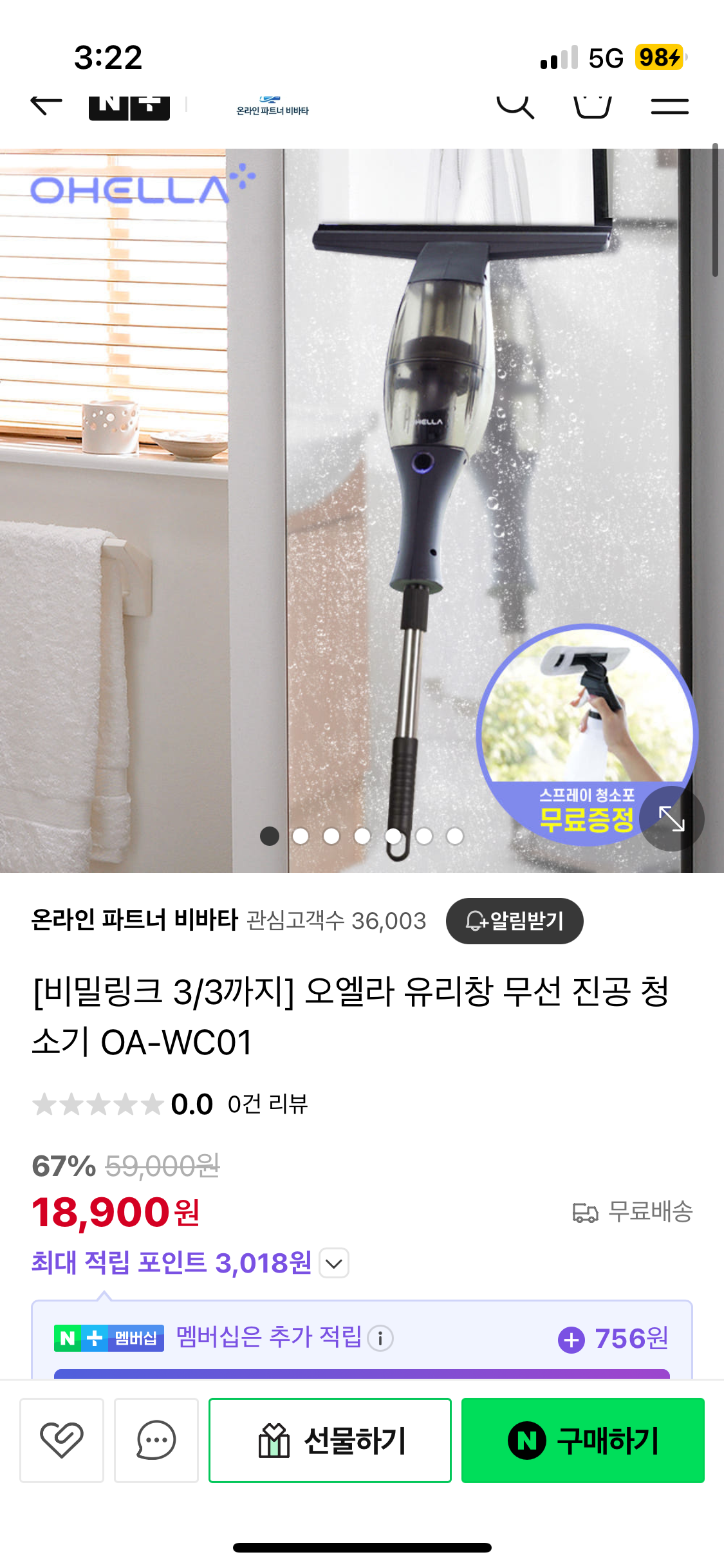 [네이버] 오엘라 유리창 무선 진공 청소기 OA-WC01 (18,900원/무배)