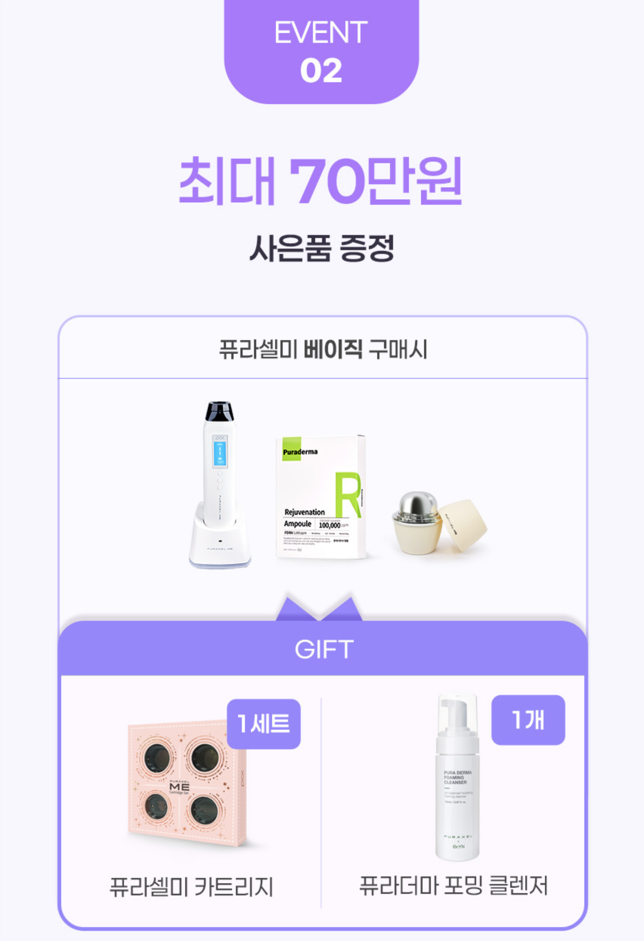 뷰티 디바이스 퓨라셀미 패키지는 자사몰에서 회원 25% 할인에 최대 70만원 사은품 증정으로 혜택이 더 커졌습니다. 신제품 포밍클렌저 100% 증정 이벤트 등등 환절기를 위한 혜택을 크게 주는 것 같으니 필요한 것 있나 살펴보시면 좋을 것 같습니다