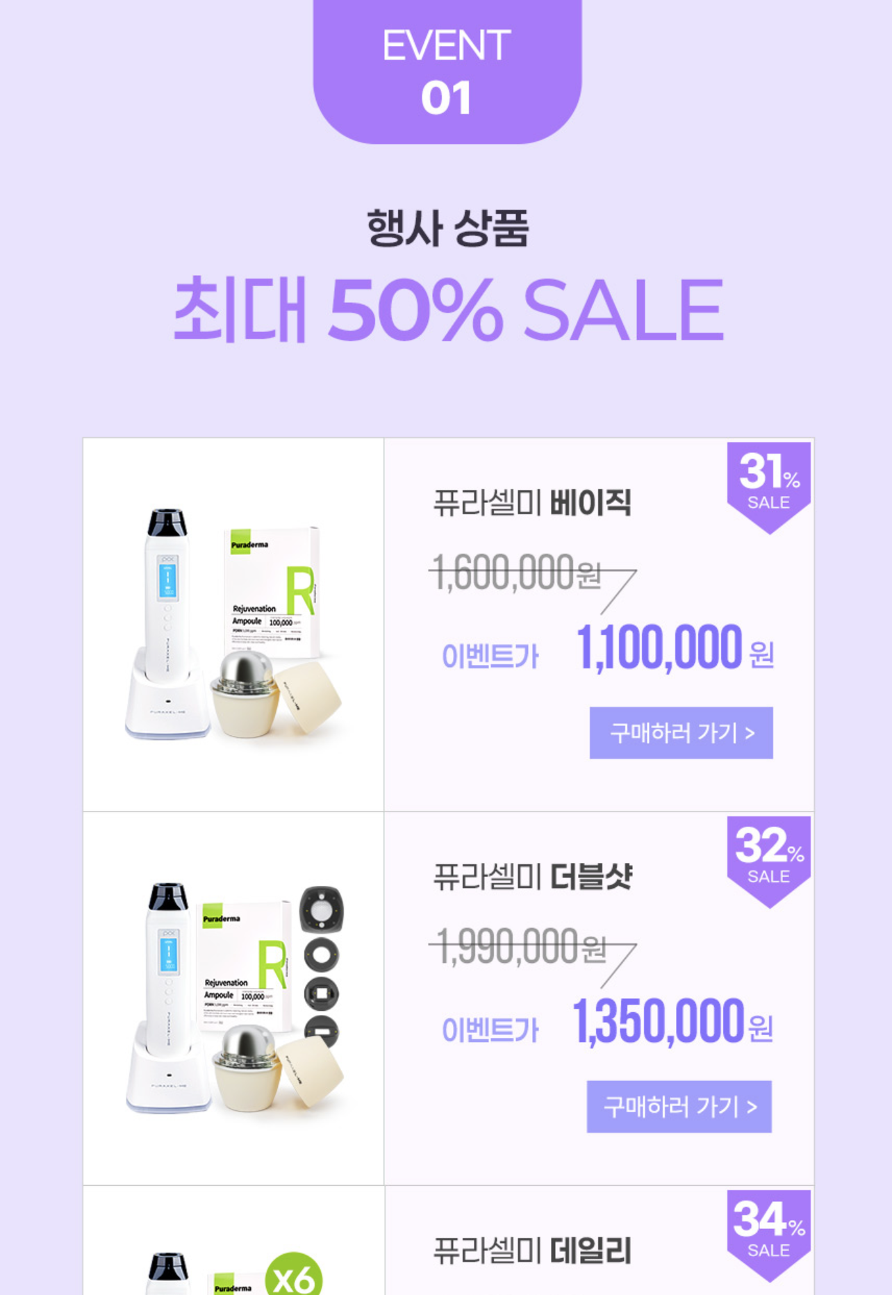 날씨가 점점 따뜻해지고 있는데, 이럴 때 일수록 피부관리 중요한 거 아시죠? 환절기에는 특히나 더요! 지금 피부 관리해보려고 알아보는데, 레이저 뷰티 디바이스로 유명한 퓨라셀미에서 공홈에서 크림, 앰플, 선블록, 리프팅 마스크 등 화장품 라인도 봄맞이 최대 50% 전품목 할인 들어가네요.