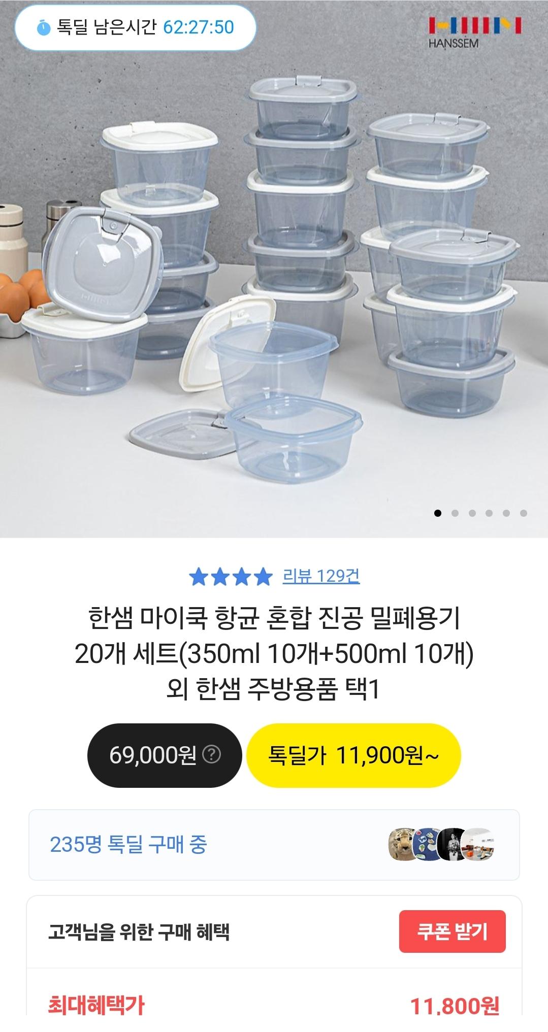 [톡딜] 한샘 마이쿡 항균 진공 밀폐용기 20개 세트 (11,800원/무료) > 국내핫딜