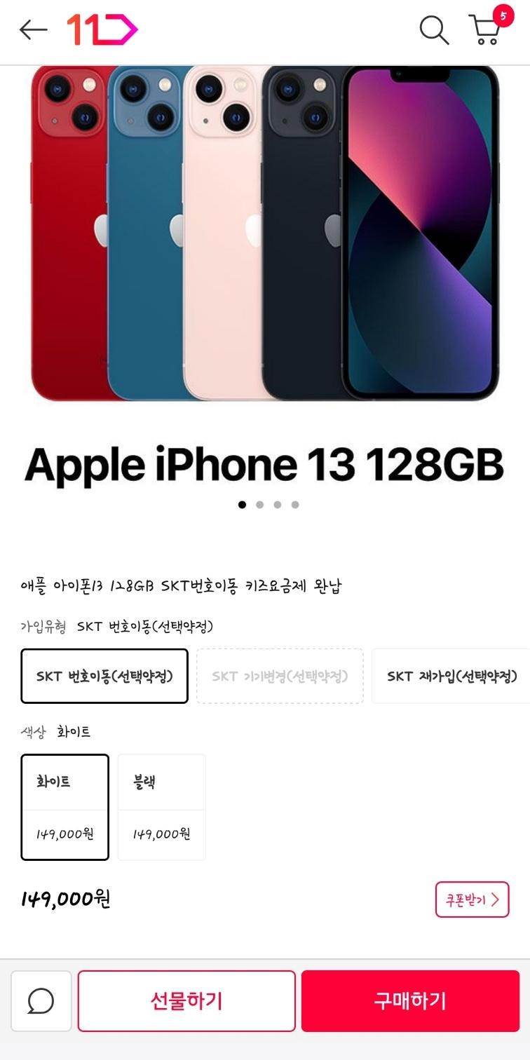 [11번가] 애플 아이폰13 128GB SK번호이동 (149000원/무료) > 국내핫딜