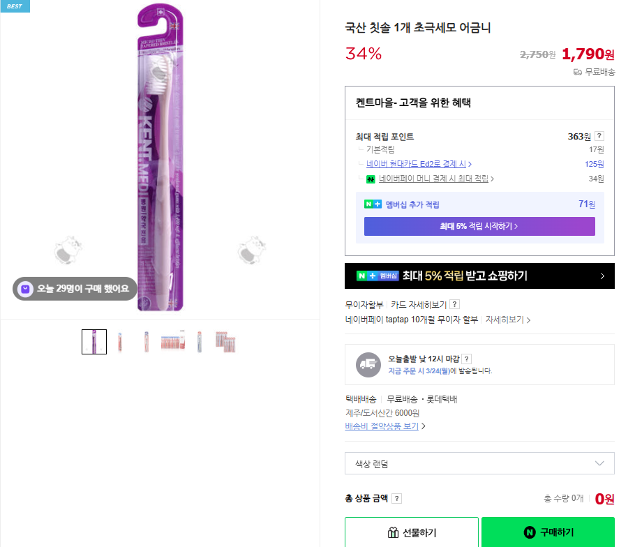 [네이버] 메디클래식 켄트 극세모 칫솔 (1,790원/무료)