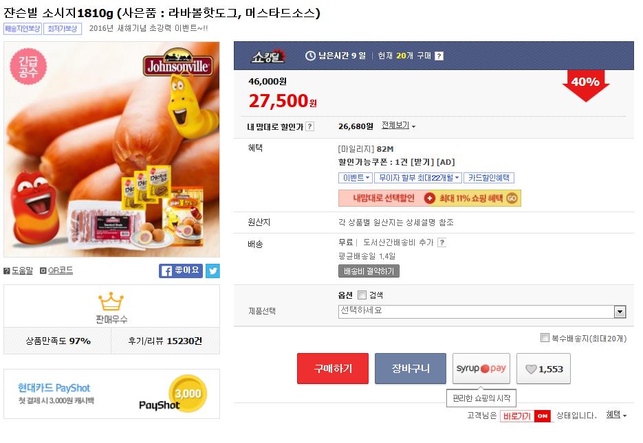[11번가] 쟌슨빌 소시지 1,810g(사은품:라바볼핫도그, 머스타드 소스) (27,500/무료) > 국내핫딜