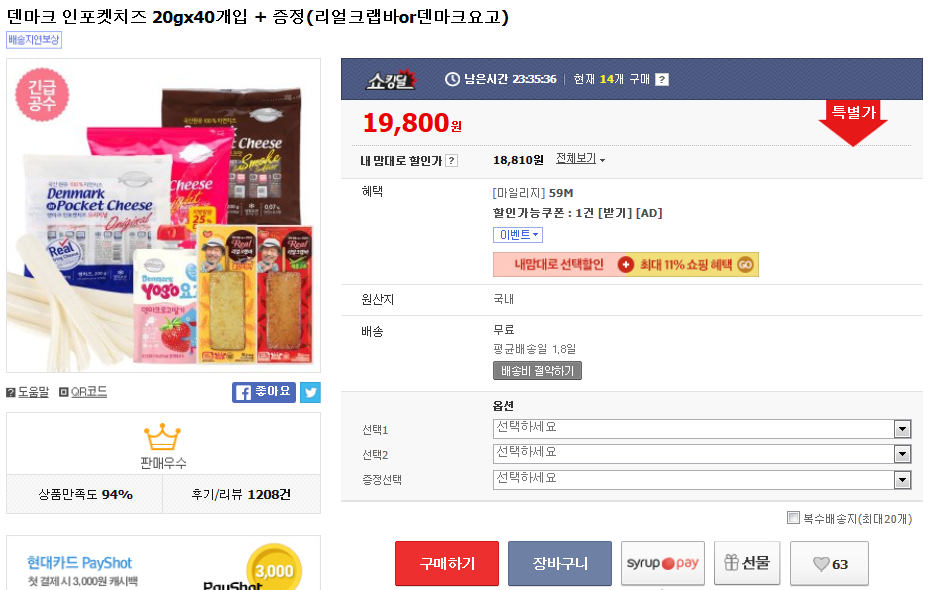 [11번가] 덴마크 인포켓치즈 20g*40개입 + 증정(리얼크랩바or덴마크요고) (19,800/무료) > 국내핫딜