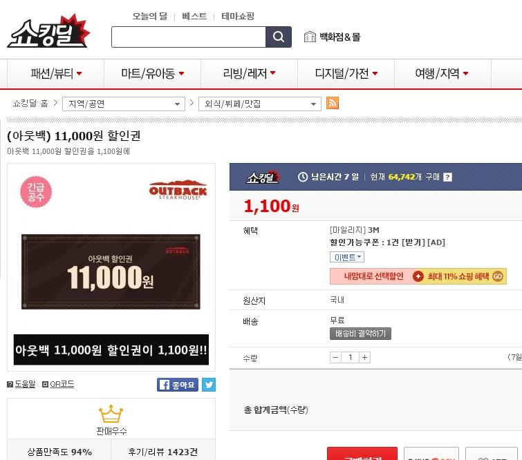 [11번가] (아웃백) 11,000원 할인권 (1,100/무료) > 국내핫딜