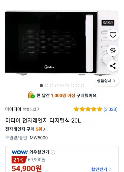 [쿠팡] 미디어 디지털식 전자레인지 20L (54,900원 / 무료) > 국내핫딜