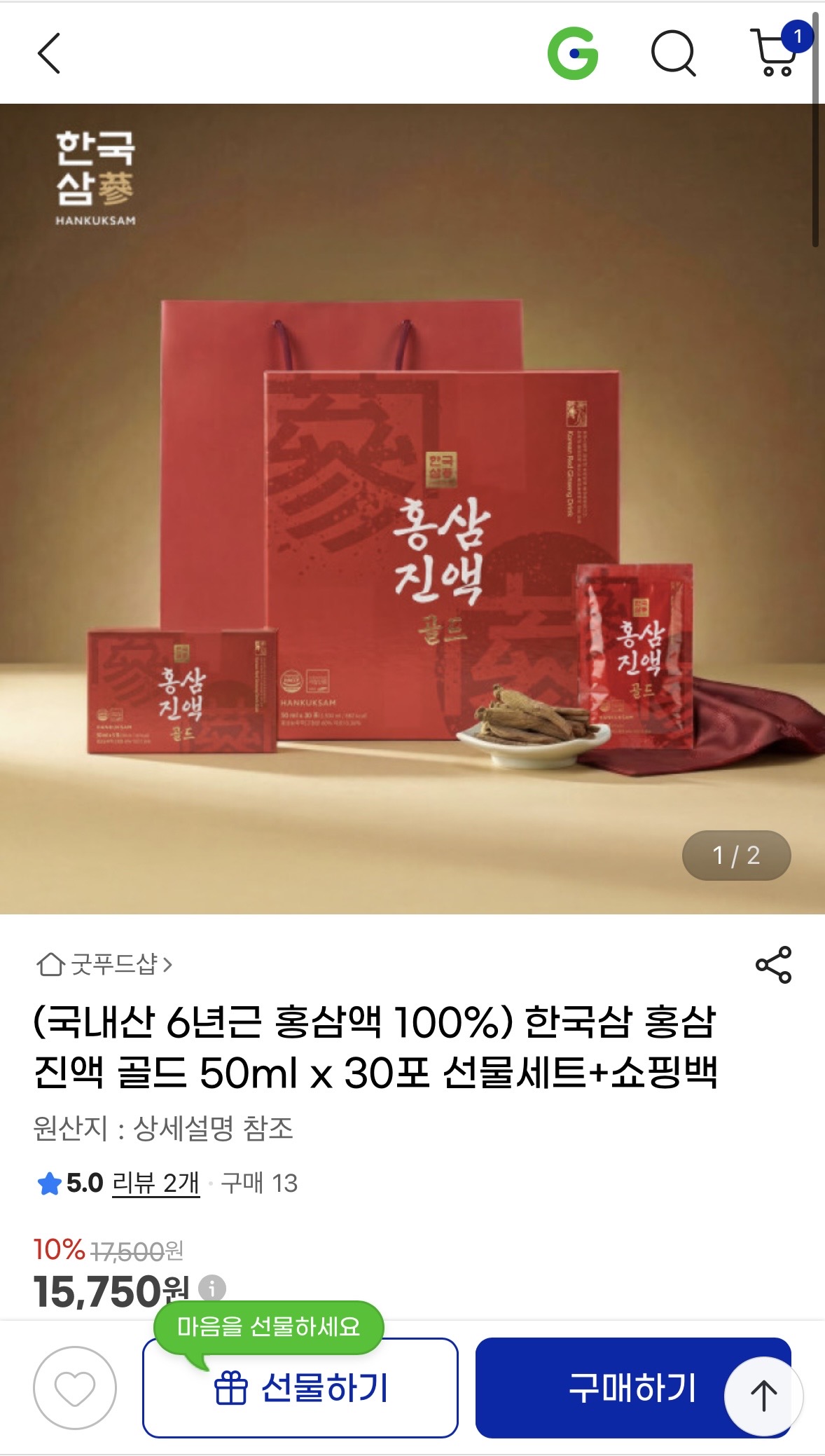[지마켓] 한국삼 홍삼진액 골드 50ml x 30포 (15,750원/무배) > 국내핫딜