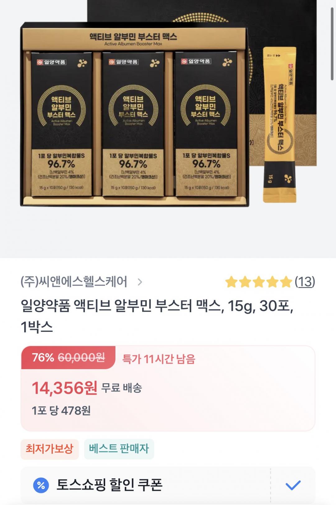 [토스쇼핑] 일양약품 액티브 알부민 부스터 맥스, 15g, 30포 (14,356원/무료)