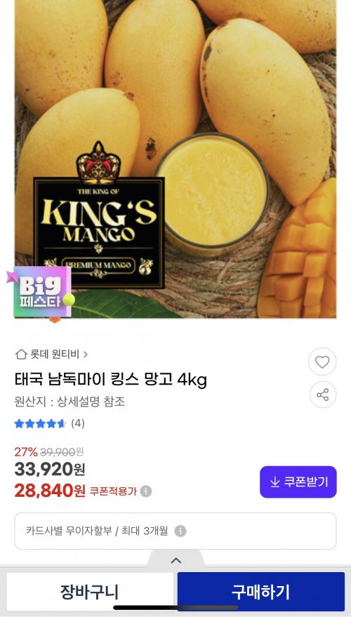 태국 남독마이 킹스망고 4kg 28,840에 판매중이네요