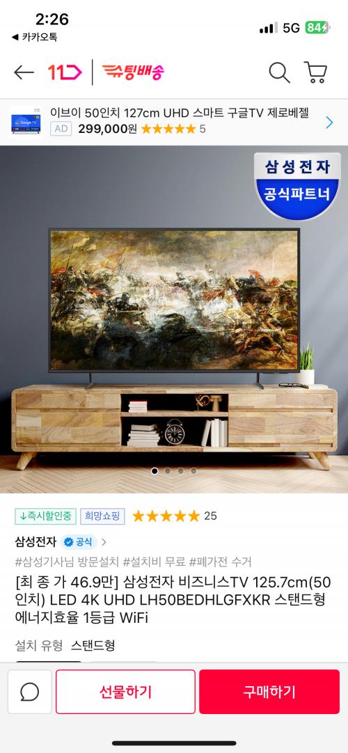 [11번가] 삼성전자 비즈니스TV 125.7cm(50인치) LED 4K UHD LH50BEDHLGFXKR 스탠드형(469,400원/무료)