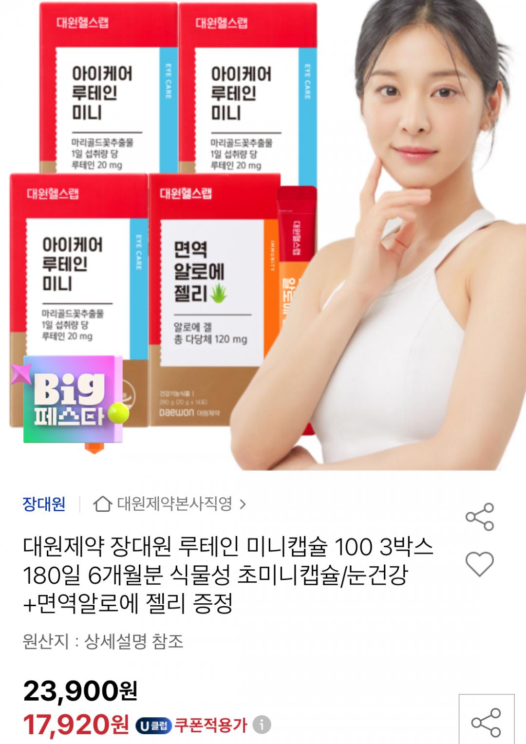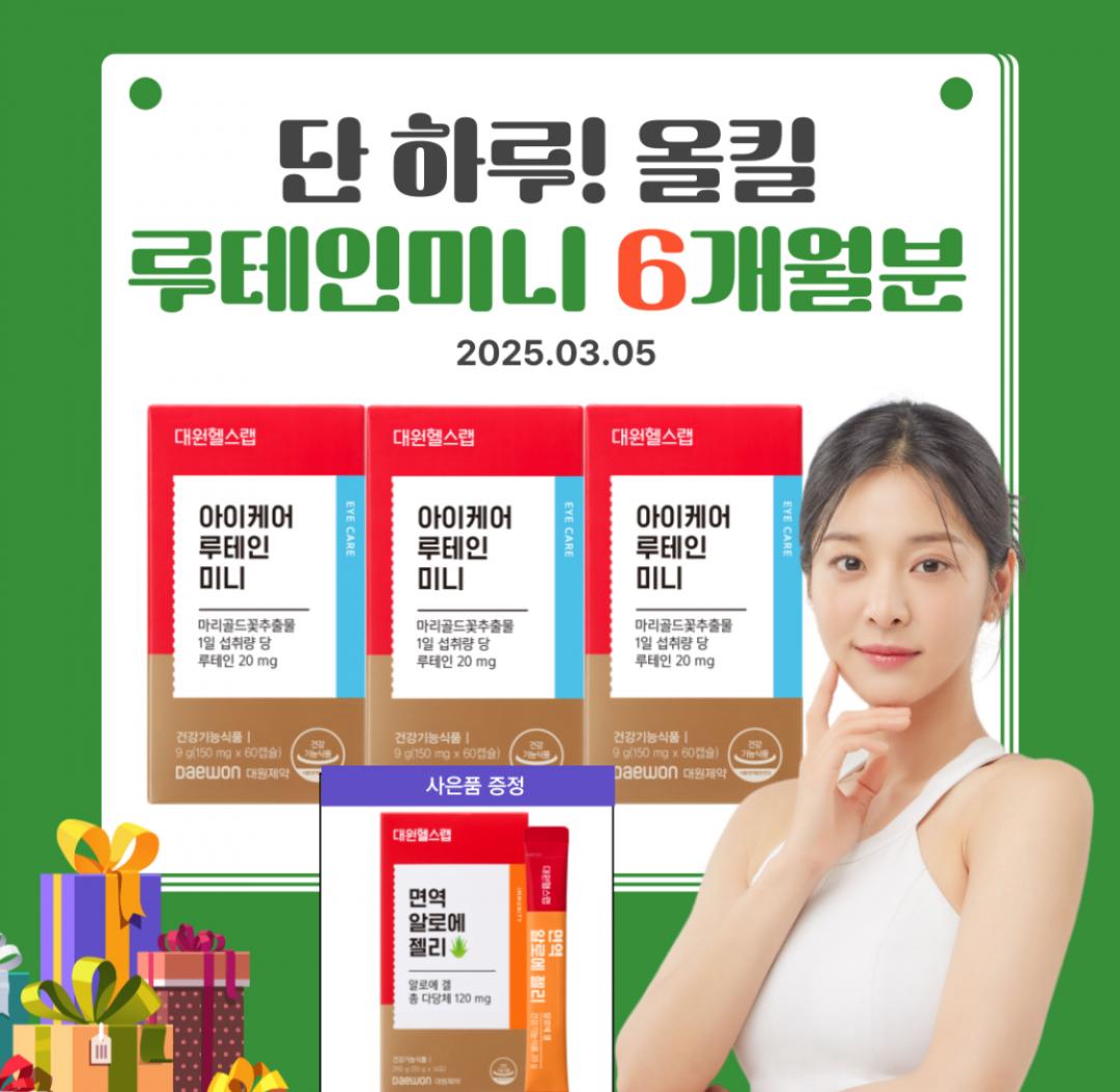 옥션에서 대원제약 루테인 미니 6개월분 구매 시 면역알로에젤리까지 증정하는 행사가 진행 중이에요.