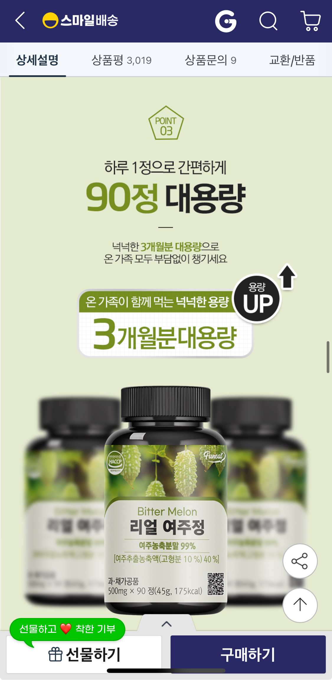 국내산 여주정인데 90정씩 대용량인데 2+1해서