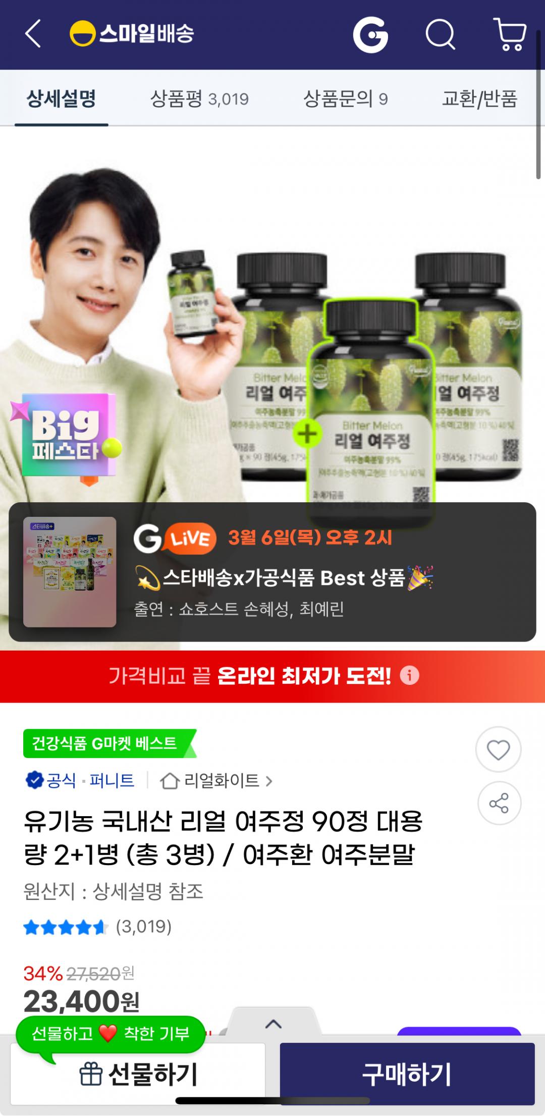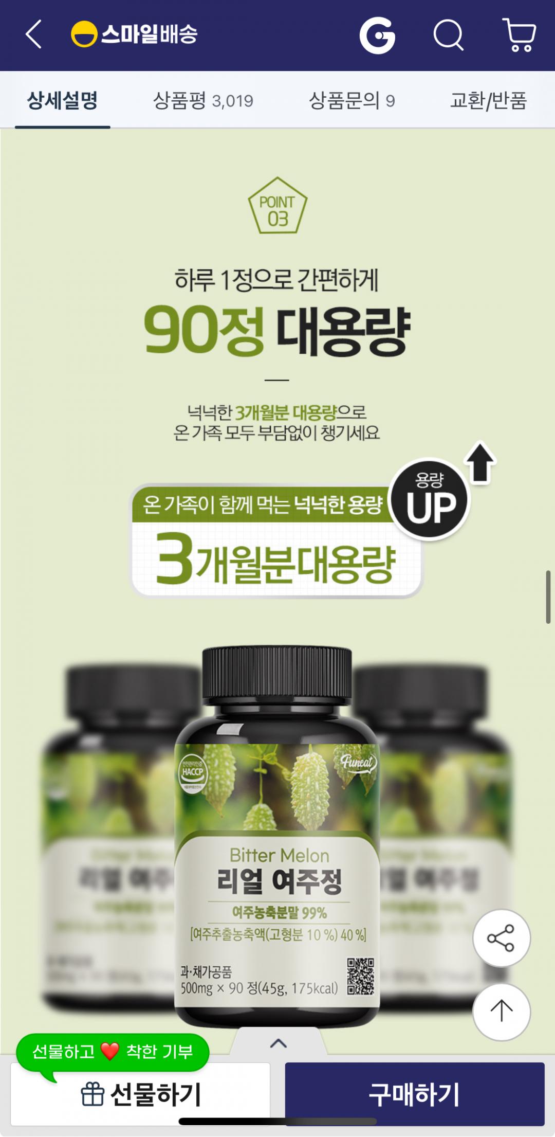 [지마켓]퍼니트 유기농 국내산 리얼 여주정 90정 대용량 2+1병 (17900/무배) > 국내핫딜