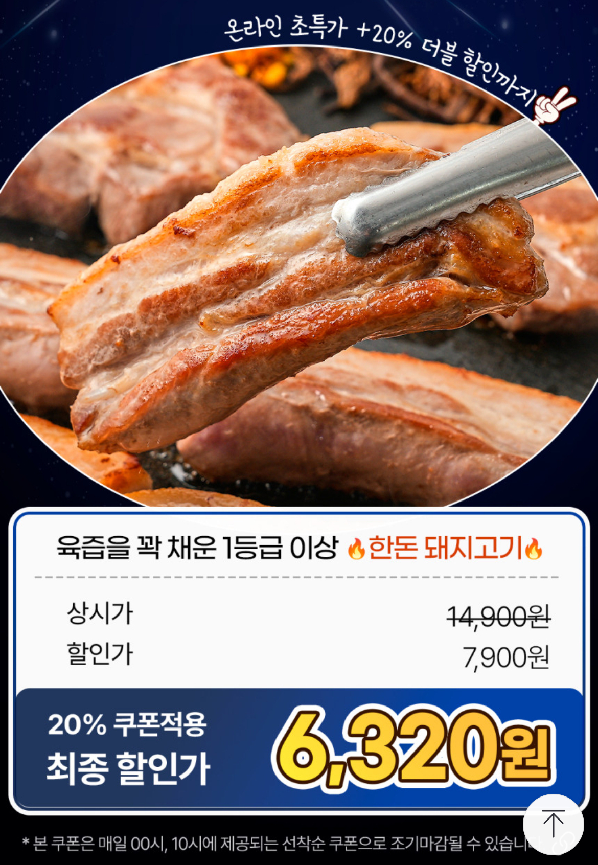 [네이버] 1등급 국내산 한돈 목살/삼겹살 500g (7,900원/유배)