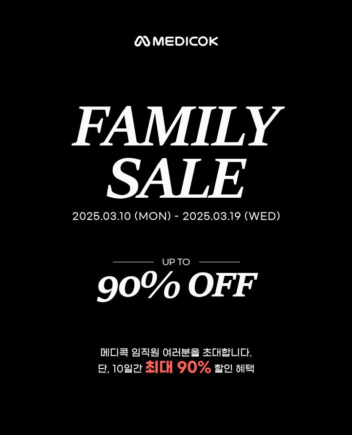 메디콕에서 임직원 및 지인 대상 패밀리 세일을 진행한다고 합니다.최대 94프로 할인된다고 하고 할인코드 입력하면 저렴하게 구매할 수 있습니다. 할인코드 입력하면 구매 가능하니 참고 부탁 드립니다(할인코드 medicok2025)
