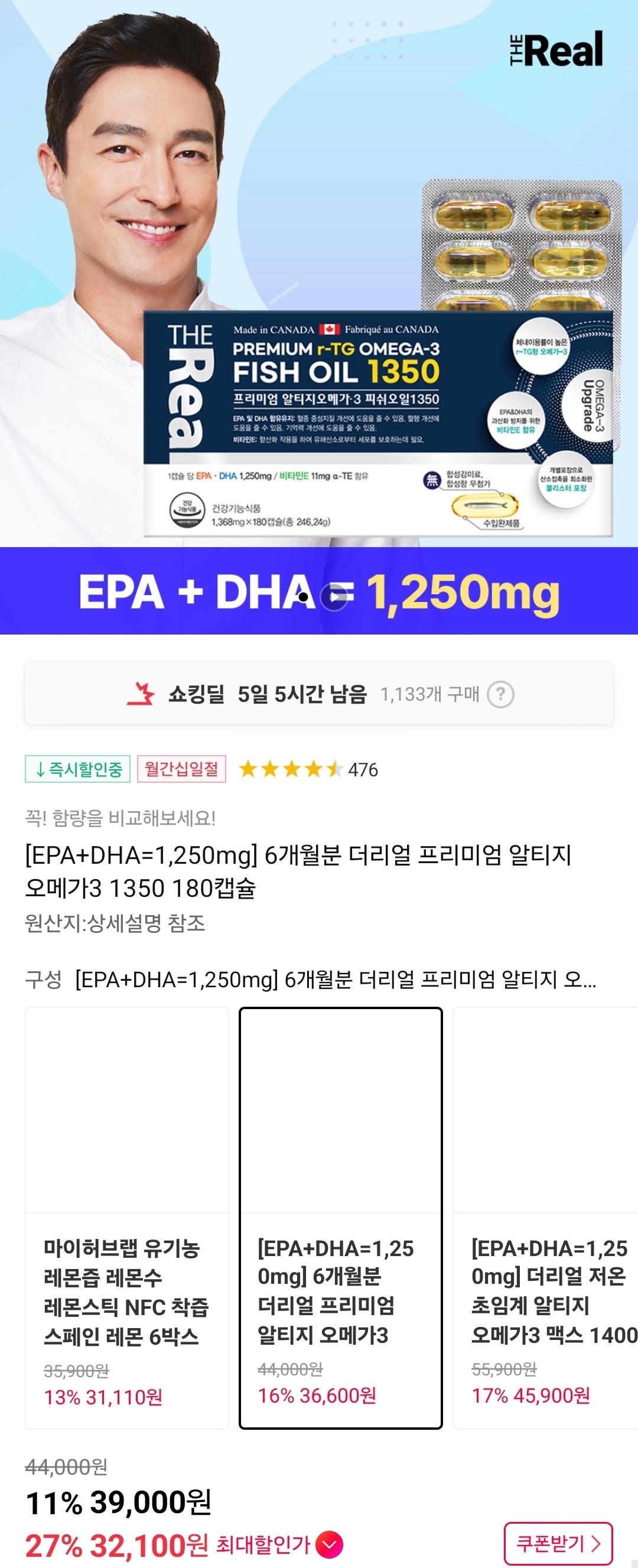 [11번가] 더리얼 프리미엄 알티지 오메가3 1350 180캡슐 (32,100원/무료)