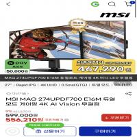 [G마켓] MSI MAG 274UPDF700 E16M 듀얼모드 게이밍 4K AI Vision 무결점 (556,210원/무배)